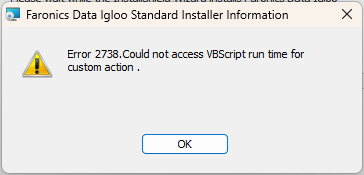 During the installation of Data Igloo you run into a error 2738 indicating that the product could not access the VBScript runtime during the installation process.
