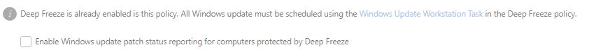 When Software Updater is enabled it will handle Windows Updates only when Deep Freeze is not enabled. When Deep Freeze is enabled Software Updater will only report on the installed updates and cannot control specific updates or provide more granular control of the update process. When Deep Freeze is enabled in the policy the only option shown will be to enable the service for reporting purposes as shown below;